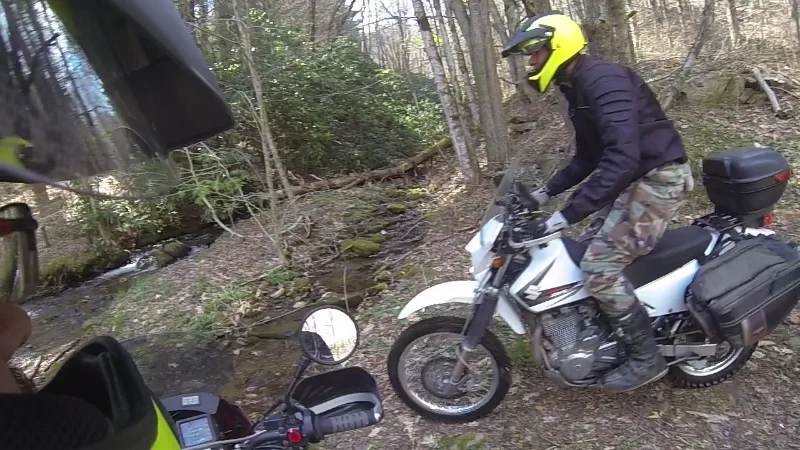 We got through the first section successfully and we stopped to take a break. I wanted Stretch to try my new Pivot Pegz out so I suggested he take a ride on the ‘ole KLR. He suggested I try his DR. I was pretty nervous about that. See, Stretch is called Stretch because he is pretty dang tall and I am NOT pretty dang tall. His seat height was about 4 inches higher than my inseam so I expressed my concern about falling and he said it would be fine and we both actually expected it. I knew he geared it lower, but what I did not know is he had a quick turn throttle cam on it. I hopped on the DR and I was trying to take it easy, but I couldn’t keep the front wheel down! It was just bobbing and giving me very little control. I managed to go about 30 feet and I crashed it into a big rock. I felt like a huge turd about it. Anywhere else I could have dropped it and no damage would have been done. You can watch the whole thing unfold in the video. Afterwards, Stretch’s comment was “15000 miles and you do more damage in 30 feet.” I cannot tell you how bad I felt about that.